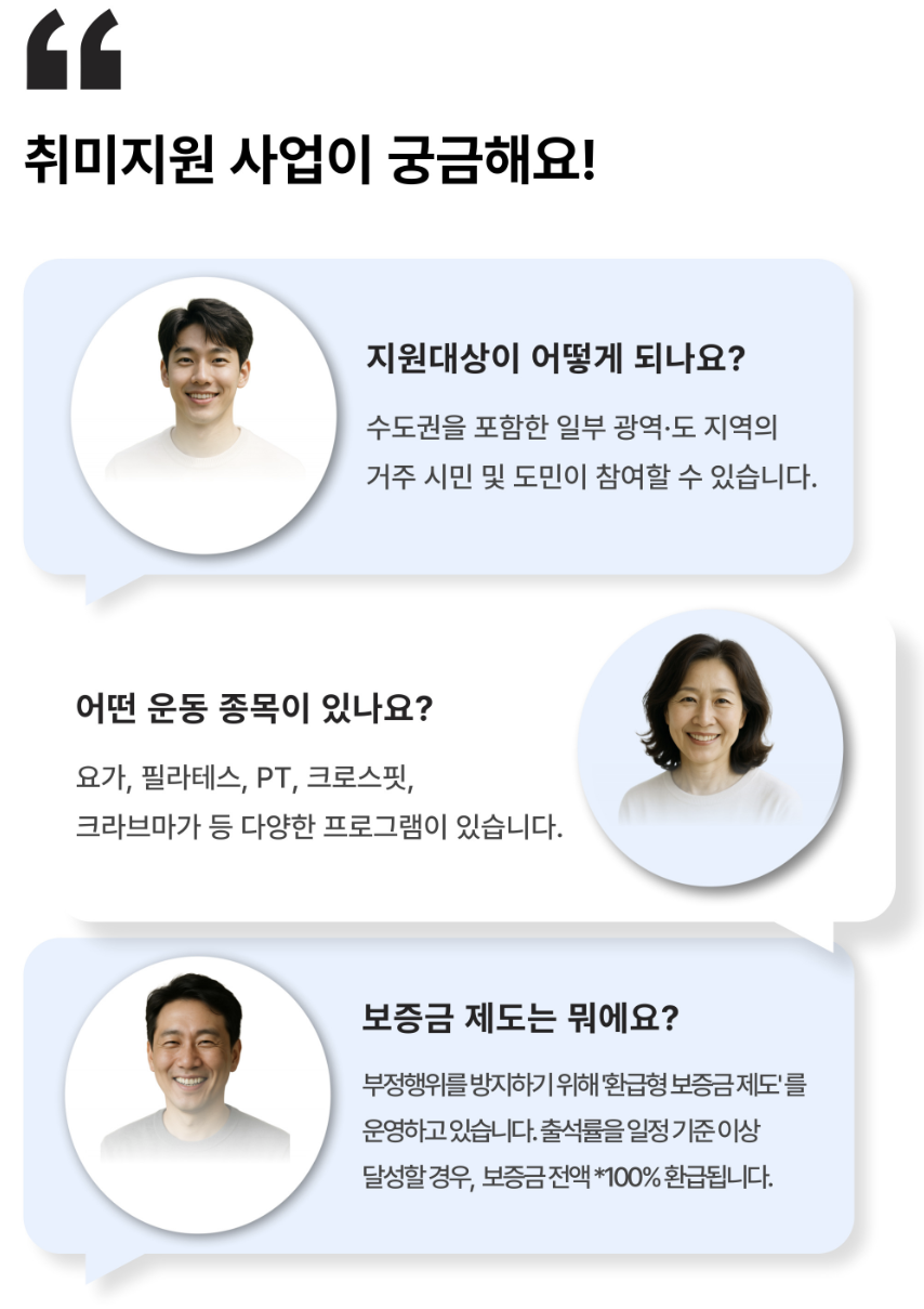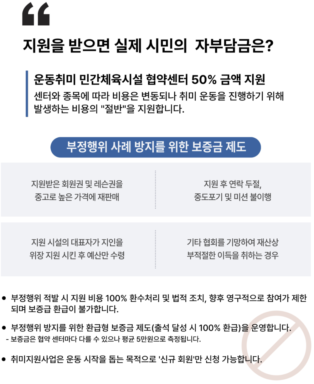 서울 취미지원사업은 "비용 때문에 운동을 시작하지 못했다"는 핑계를 완전히 없애주는 제도입니다. 운동비의 절반을 지원받고, 출석만 성실히 하면 보증금까지 돌려받을 수 있으니 부담 없이 새로운 운동에 도전할 수 있습니다.